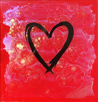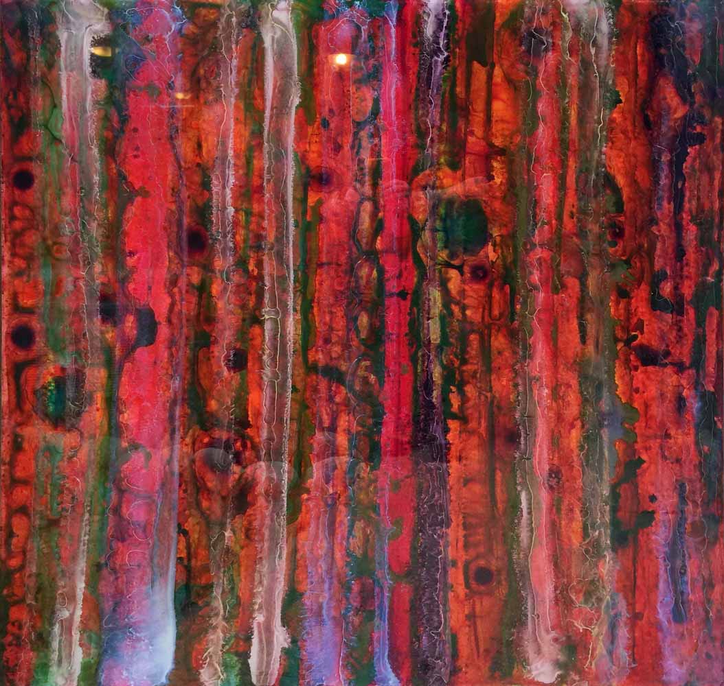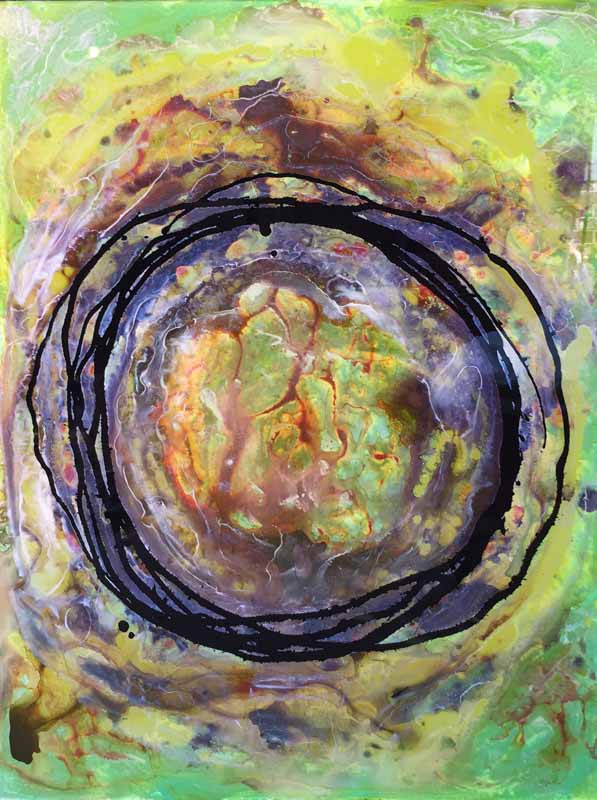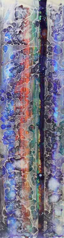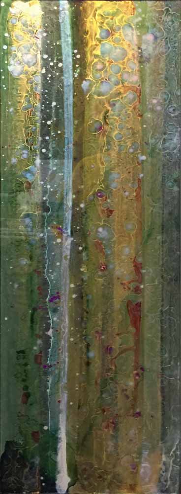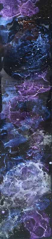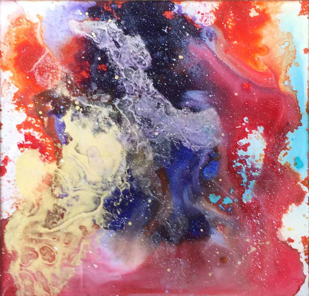 a mixture of iridescent inks, paints and acrylic paint in a style I have been working on for over 30 years but with the new technique of painting it in reverse, so that the presentation is a gorgeous, slick look that resembles a sheet